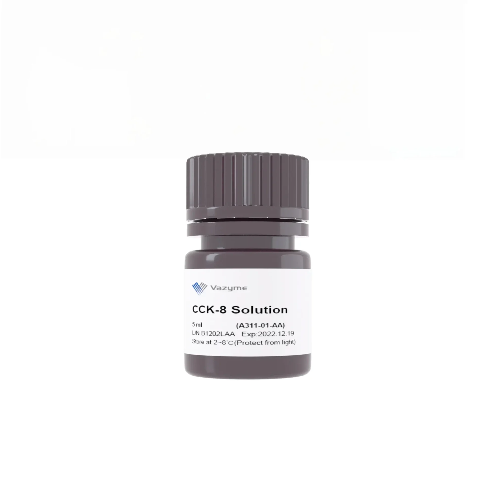 CCK-8 Cell Counting Kit is based on WST-8 [2-(2-methoxy-4-nitrophenyl)-3-(4-nitrophenyl)-5-(2,4-disulfophenyl)-2H-tetrazolium, monosodium salt] that is rapidly absorbing, highly sensitive and widely used in detection of cell proliferation and cytotoxicity. The amount of formazan dye generated by dehydrogenases in living cells is directly proportional to the number of living cells. Measure the Optical Density at 450 nm, using a microplate reader. The measurements can indirectly show the number of living cells. CCK-8 Cell Counting Kit contains CCK-8 Solution, which is a ready-to-use reagent. CCK-8 Solution can be directly added to cell samples. After Incubating the mixed solution for a certain period of time, the assay can be performed without preparing various components in advance.