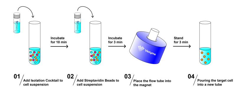 Mouse CD8+ T Cell Isolation Kit is designed to isolate CD8+ T cells from single-cell suspensions of mouse spleen, lymph nodes, and other tissues by the negative selection method. The principle is to use biotin-labeled monoclonal antibodies to label non-target cells, and then use streptavidin magnetic beads to remove non-target cells, thereby to achieve the purpose of mouse CD8+ T cell sorting. This product can obtain the target cells in only 16 min with the purity rate of up to 96%. There is no abnormal activation of cells after sorting, thus not affecting downstream experiments. The isolation process requires the use of magnetic poles or magnetic racks.