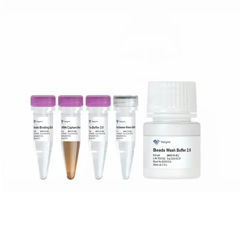 VAHTS mRNA Capture Beads 2.0 are 1 μm Oligo(dT)-coupled paramagnetic microspheres intended for the isolation of poly(A)+ RNA from purified total RNA. The magnetic separation technology allows for the isolation of intact mRNA in small sample volumes, eliminating the need for mRNA precipitation. The whole workflow can be completed in 1 h.
